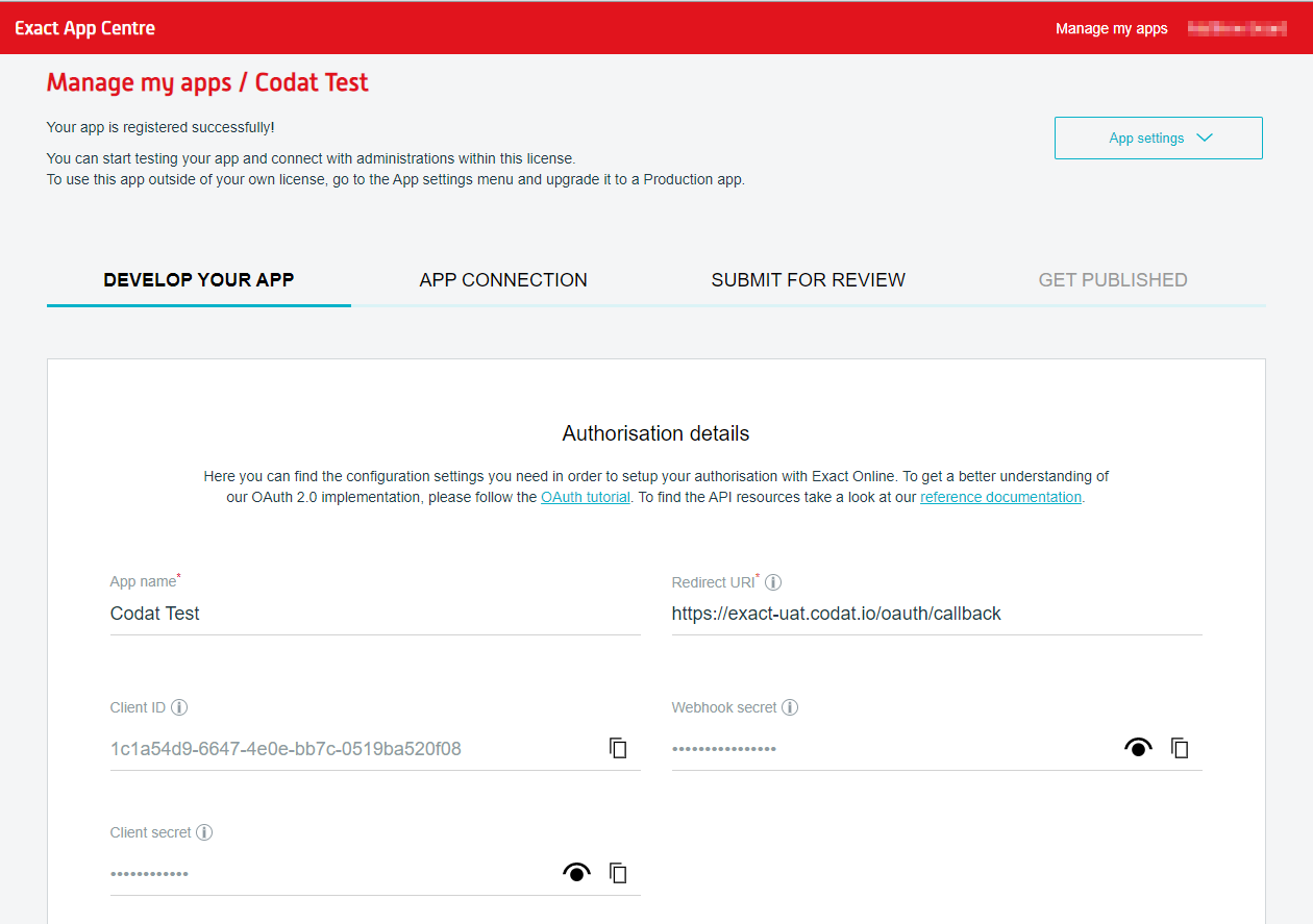 • The Redirect URL must be as follows, for both production and testing apps: https://exact.codat.io/oauth/callback
